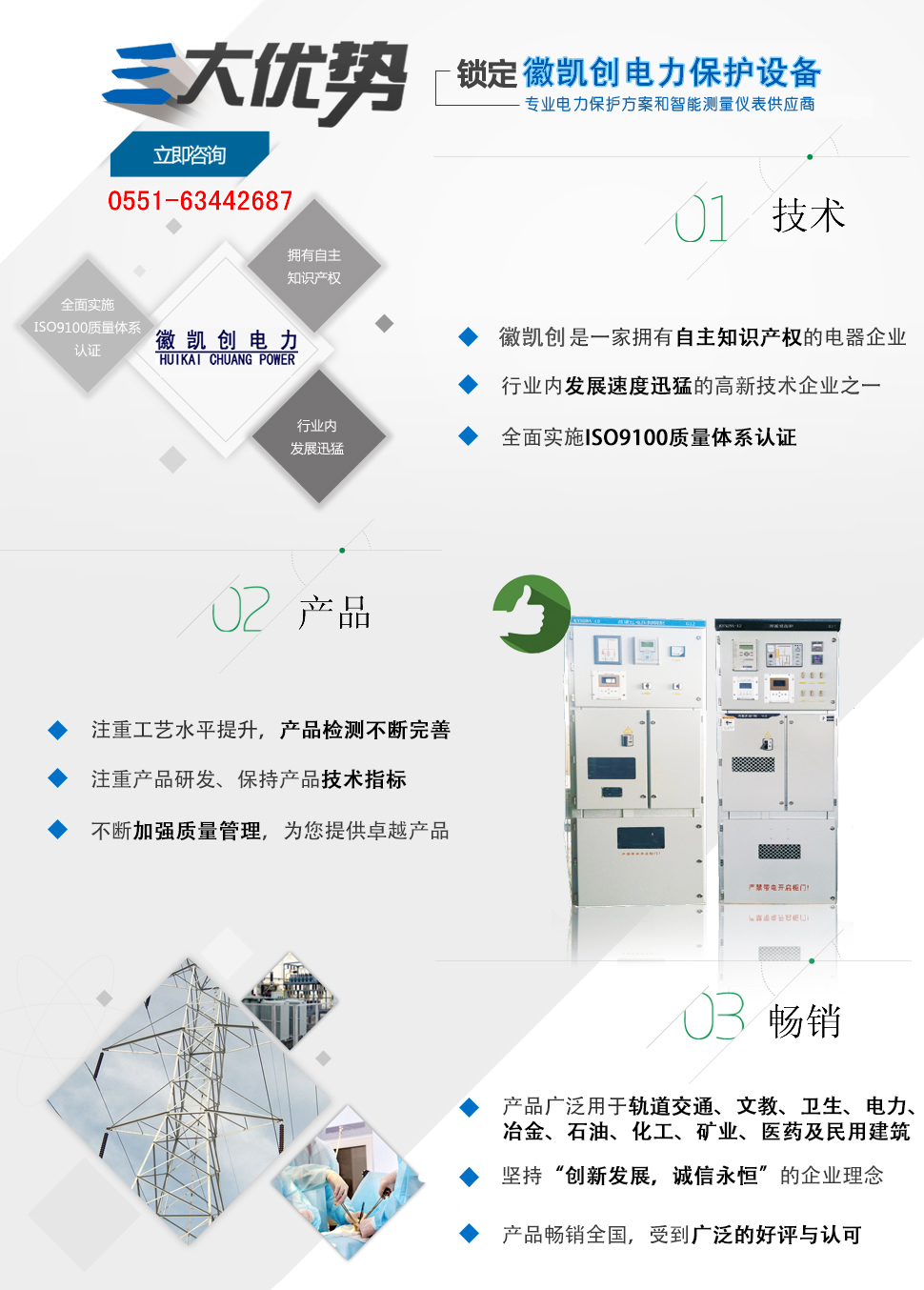 安徽徽凱創(chuàng)電力保護(hù)設(shè)備有限公司主要從事新型電氣設(shè)備、電子設(shè)備、智能控制技術(shù)的產(chǎn)品研發(fā)、生產(chǎn)、銷售。主要產(chǎn)品有:智能型消弧消諧裝置、消諧過電壓抑制柜、 組合式過電壓保護(hù)、智能型開關(guān)柜智能操控裝置、微機(jī)消諧、小電流選線、電弧光保護(hù)裝置、智能在線絕緣監(jiān)測(cè)裝置等電氣產(chǎn)品。 產(chǎn)品廣泛用于石化、煤炭、電力、建筑、市政、機(jī)場(chǎng)、鐵路、醫(yī)院、學(xué)校等領(lǐng)域,受到用戶一致好評(píng)。
